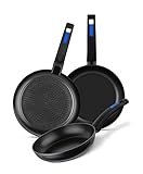 - SET SARTENES: Set de 3 sartenes de 18, 22 y 26 cm. Los diámetros de los fondos inductores son: sartén pequeña 12 cm, sartén mediana 15 cm y sartén grande 18 cm.